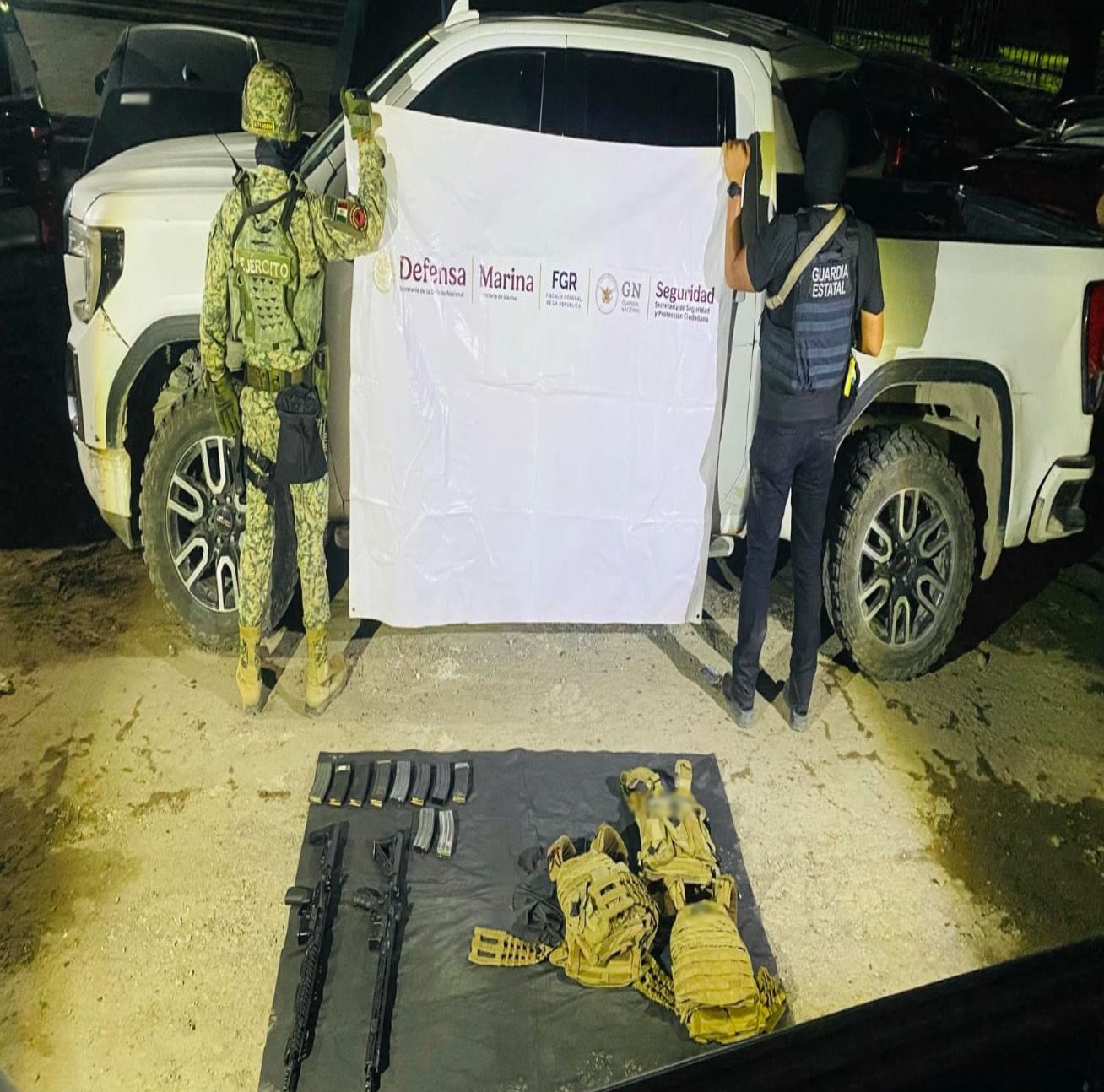 El aseguramiento incluyó tres armas largas, 30 cargadores, 410 cartuchos útiles, ocho radios de comunicación y 21 chalecos, equipo que se presume era utilizado para alertar sobre la presencia de las autoridades y reforzar la operatividad de los grupos delictivos.