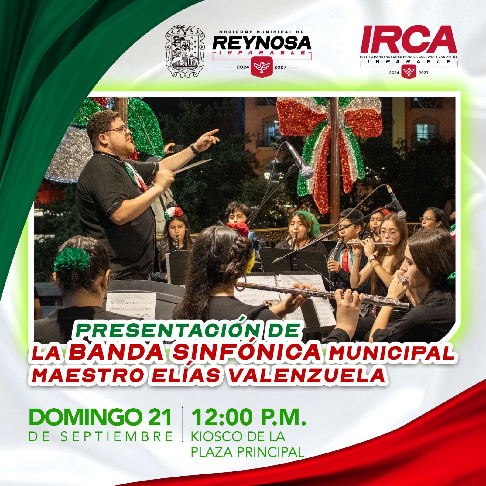 El Gobierno de Reynosa, que preside el Alcalde Carlos Peña Ortiz, invita este domingo 21 de septiembre a disfrutar del programa artístico que el Instituto Reynosense para la Cultura y las Artes presentará en plazas públicas de la ciudad.