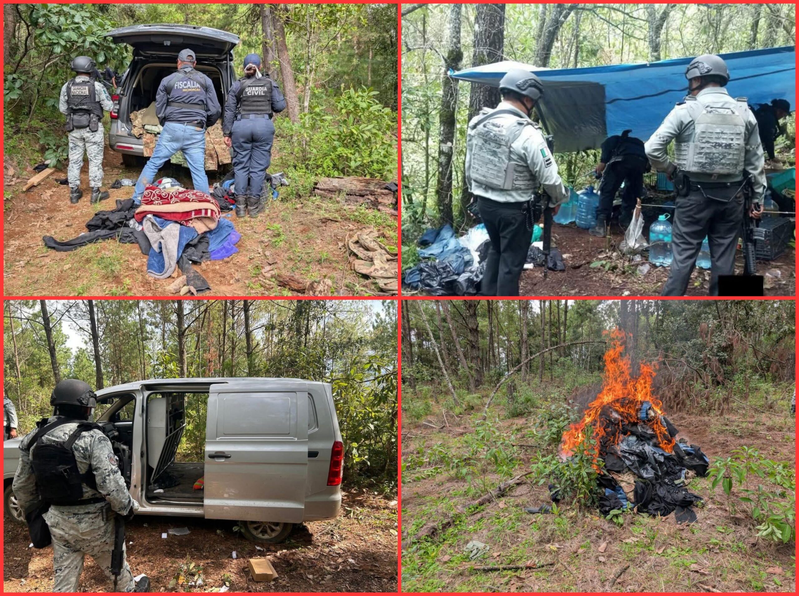 Durante la intervención, los agentes localizaron estructuras improvisadas que funcionaban como bases de operación y puntos de vigilancia. En el lugar se aseguraron dos vehículos, uno de ellos con reporte de robo, además de ropa táctica, cobertores, víveres y utensilios para la preparación de alimentos, lo que confirmaría el uso de los campamentos para pernoctar y sostener actividades ilícitas en la zona.