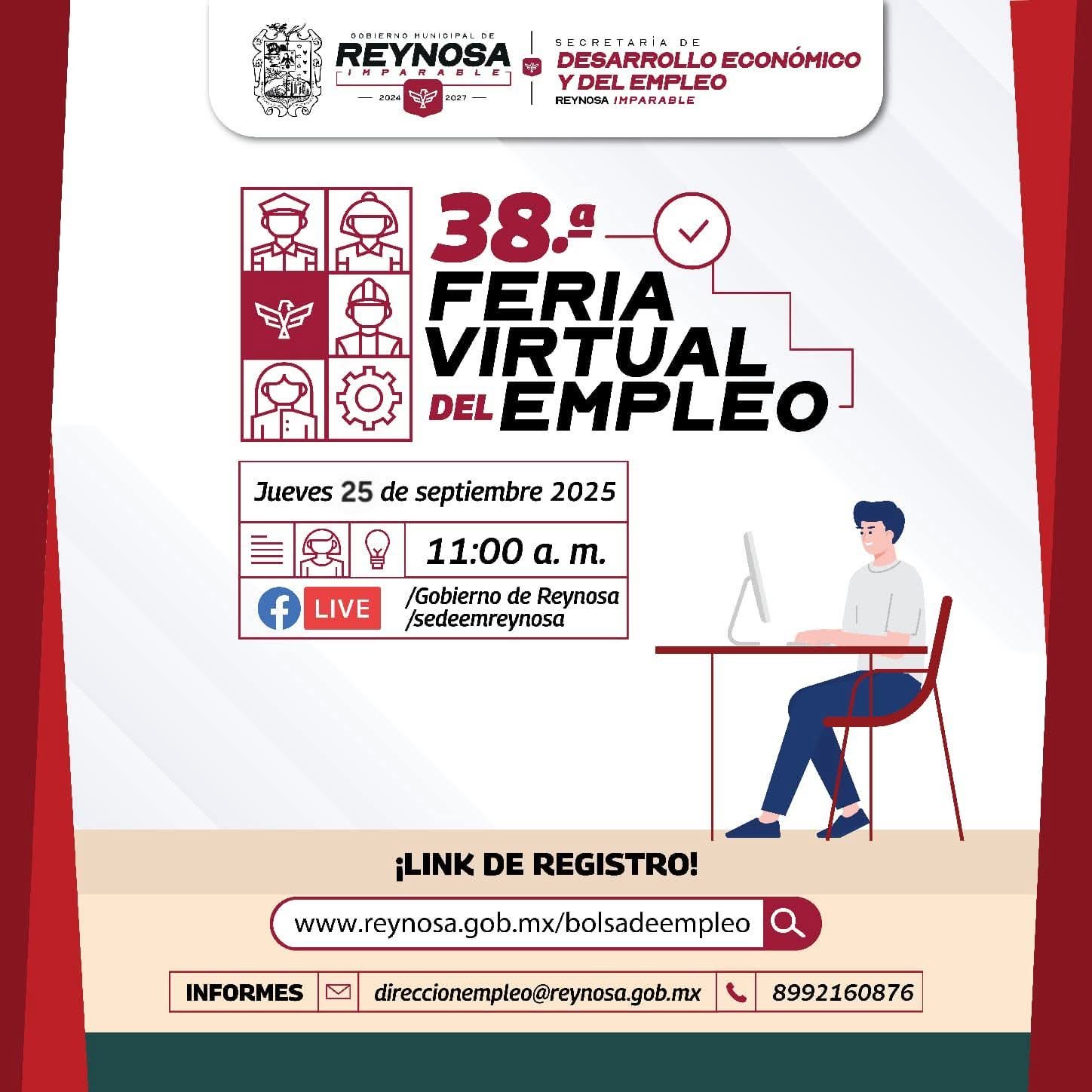 El Presidente Municipal Carlos Peña Ortiz invita a la población trabajadora, hoy jueves 25 a las 11:00 de la mañana, a participar en la 38° Feria Virtual de Empleo, donde tendrán acceso a múltiples vacantes en la industria, el comercio y la prestación de servicios.