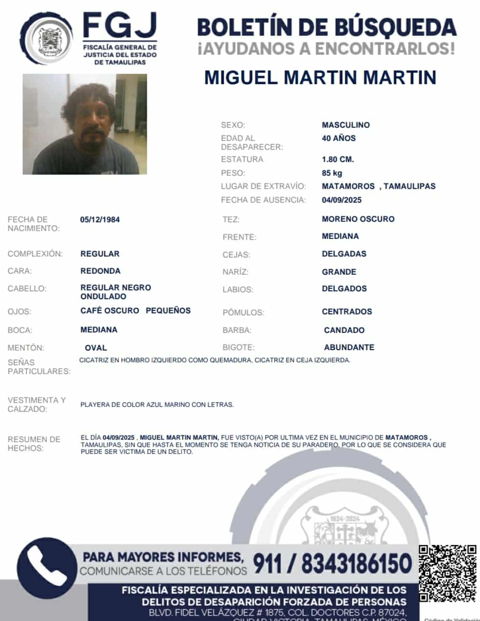 La desaparición de Miguel Martín Martín, de 40 años de edad, ocurrida el pasado 4 de septiembre en Matamoros, mantiene en alerta a las autoridades y a la comunidad, mientras su familia solicita el apoyo ciudadano para dar con su paradero.