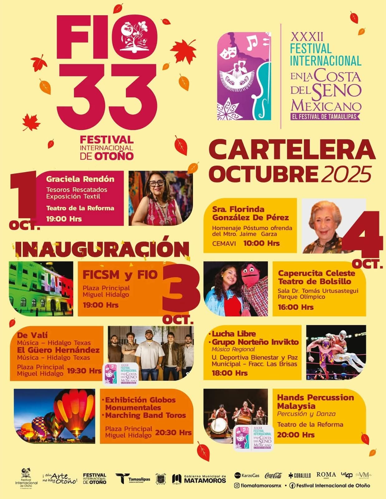 El Gobierno Municipal de Matamoros y el alcalde Beto Granados anunciaron el inicio del Festival Internacional de Otoño (FIO) en su edición número 33, un evento que cada año reúne a cientos de familias en torno al arte y la cultura. La cartelera arranca este 1 de octubre con la exposición textil “Tesoros Rescatados” de Graciela Rendón, a las 19:00 horas en el Teatro de la Reforma.