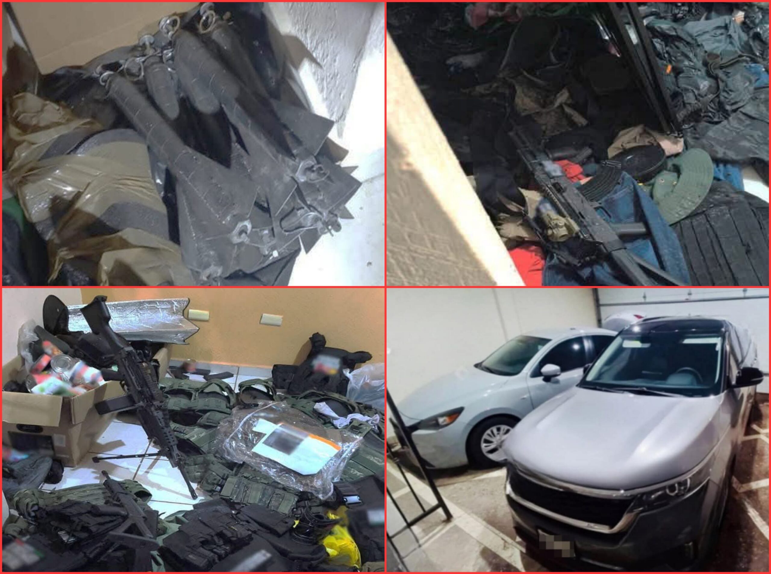 Durante la inspección al domicilio, se decomisaron 14 armas largas de diferentes calibres, entre ellas fusiles 5.56×45 mm y 7.62×39 mm, además de 12 artefactos explosivos, 12 chalecos tácticos, cargadores abastecidos, cartuchos útiles y dos vehículos, un Kia Seltos 2021 y un Mazda 2 modelo 2024.