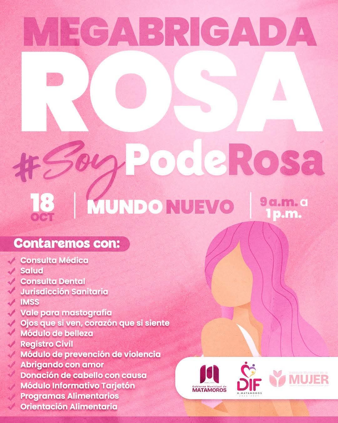 El Sistema DIF Matamoros, encabezado por Ana Ariceaga de Granados, en coordinación con el Instituto Municipal de la Mujer, invita a todas las mujeres de la ciudad a participar en la Mega Brigada Rosa, un evento enfocado en la salud integral, la prevención y el bienestar emocional, que se llevará a cabo el 18 de octubre en el Centro de Convenciones Mundo Nuevo, de 9:00 a.m. a 1:00 p.m.
