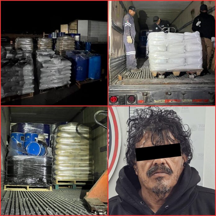 Durante la inspección a un tractocamión acoplado a una caja seca, los agentes federales detectaron materiales con características propias de precursores químicos. Tras realizar el conteo, se confirmó el hallazgo de 300 costales con 7 mil 500 kilos de acetona de plomo, 36 costales con 900 kilos de ácido tartárico, 20 tambos con 4 mil litros de etanol, 4 mil 500 kilos de sosa cáustica, 3 mil litros de sustancias líquidas adicionales y 100 kilos de un polvo blanco que será analizado por peritos.