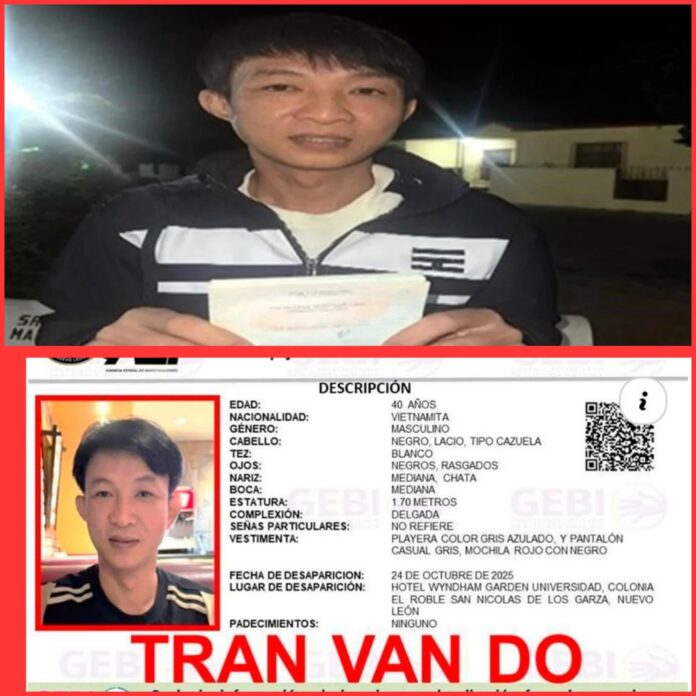 La Fiscalía General del Estado de Nuevo León, junto con autoridades de Tamaulipas, confirmó que Van Do, de aproximadamente 40 años de edad, había desaparecido el pasado 24 de octubre después de salir de un hotel en San Nicolás de los Garza. La dependencia señaló que el extranjero se encontraba aparentemente en tránsito hacia la frontera con Estados Unidos al momento de su desaparición.