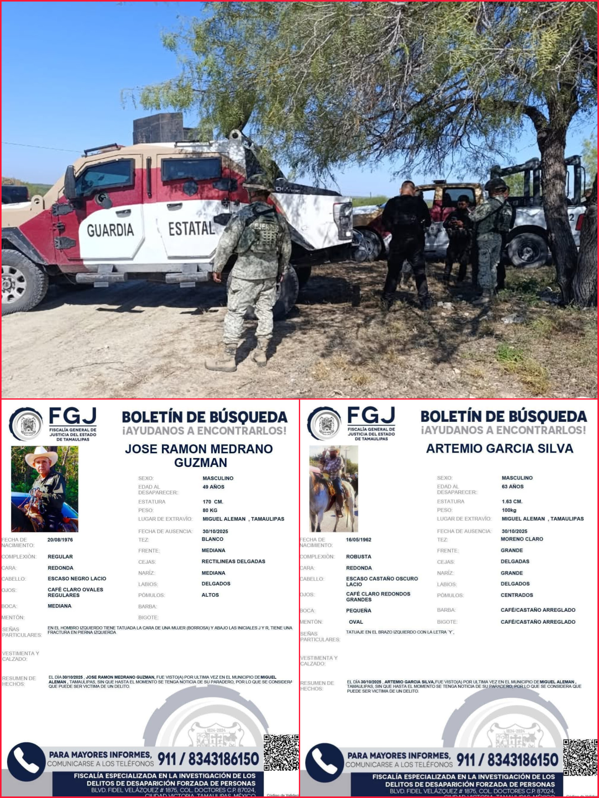 Elementos del 25/o. Regimiento de Caballería Motorizado, junto con agentes del Operativo “Frontera Grande” de la Guardia Estatal y personal de la Fiscalía General de Justicia del Estado de Tamaulipas (FGJ), reactivaron este sábado las labores de búsqueda de los señores José Ramón Medrano Guzmán y Artemio “Temo” García Silva, reportados como desaparecidos desde el pasado 30 de octubre en el municipio de Miguel Alemán.