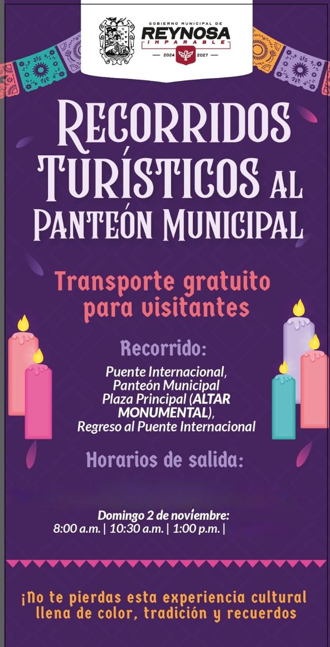 El Presidente Municipal Carlos Peña Ortiz invita a los residentes del Valle del Sur de Texas a disfrutar de los Recorridos Turísticos al Panteón Municipal; el transporte gratuito para visitantes estará disponible este domingo 2 de noviembre en el Puente Internacional Benito Juárez, -cruce Reynosa-Hidalgo-, desde las 8:00 de la mañana.
