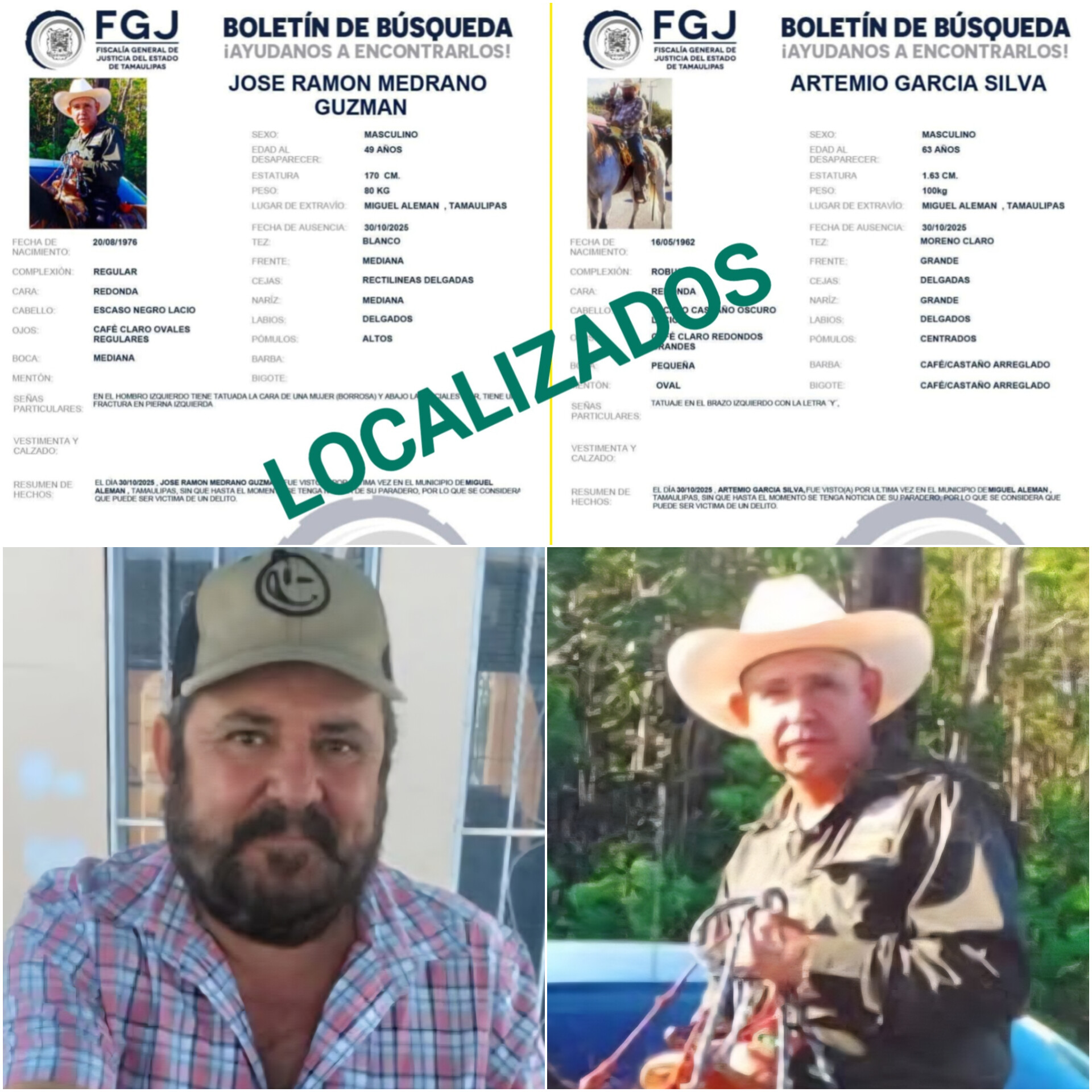 Los señores Artemio García Silva y José Ramón Medrano Guzmán, reportados como desaparecidos desde el pasado 30 de octubre en el municipio de Miguel Alemán, fueron rescatados con bien por elementos del 25/o. Regimiento de Caballería Motorizado, como parte de las acciones del operativo “Frontera Grande”.