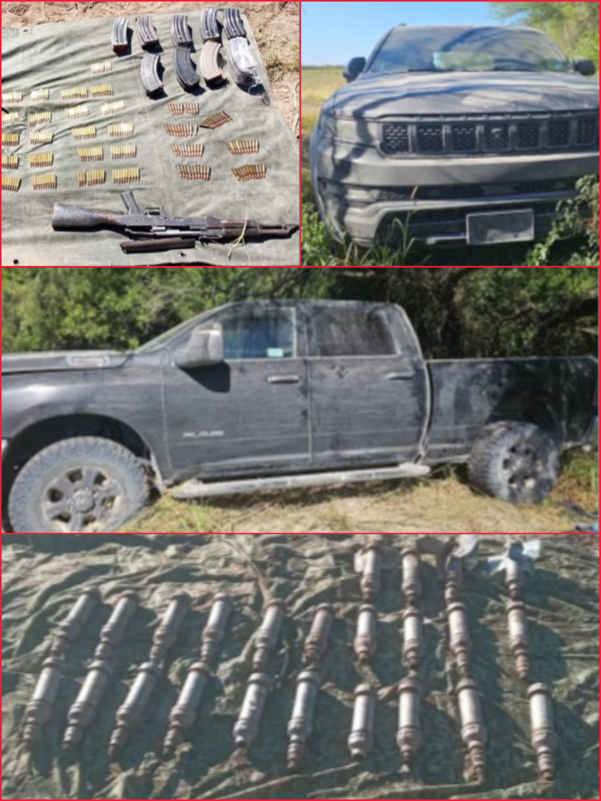 Elementos del Ejército Mexicano decomisaron un importante arsenal en el municipio de Camargo, Tamaulipas, como parte de las acciones de seguridad contempladas en la Estrategia Nacional de Seguridad Pública. El operativo se realizó el pasado 31 de octubre en el poblado El Azúcar, donde los militares localizaron dos vehículos ocultos entre la vegetación, aparentemente abandonados.
