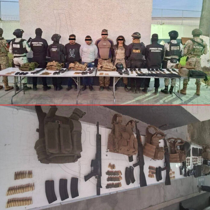 Los detenidos fueron identificados como Fernando “N” (21 años), Sixto “N” (29), Néstor “N” (39) y Brenda “N” (25), a quienes se les aseguraron cuatro armas largas, 71 cartuchos útiles, ocho chalecos balísticos con sus cargadores y 18 cargadores adicionales con 15 municiones cada uno.