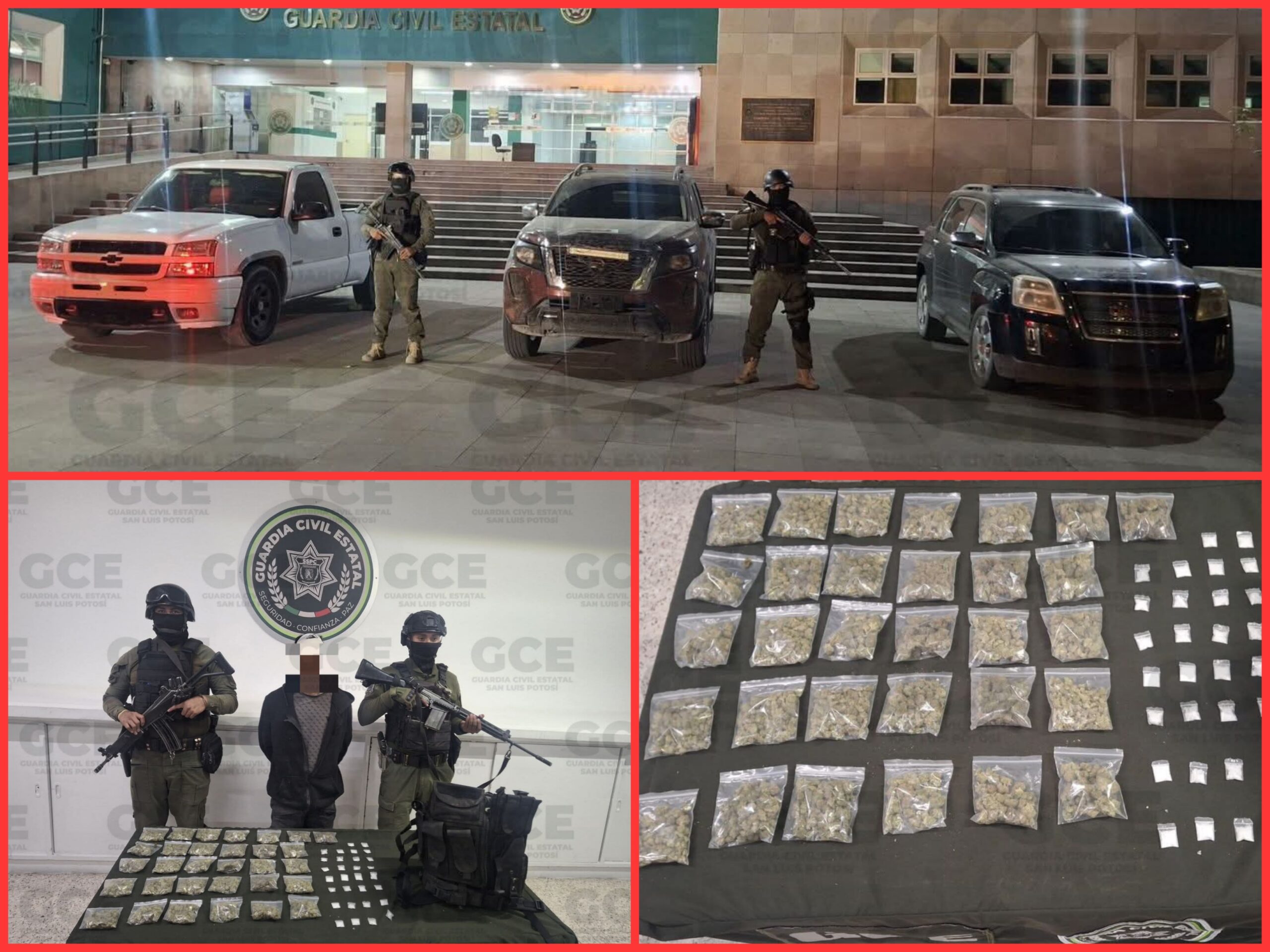 Elementos de la Guardia Civil Estatal desplegaron un operativo en la región Altiplano que derivó en una persecución, logrando la recuperación de tres vehículos con reporte de robo y el aseguramiento de más de sesenta dosis de droga, entre ellas aproximadamente treinta de “cristal” y treinta de marihuana.