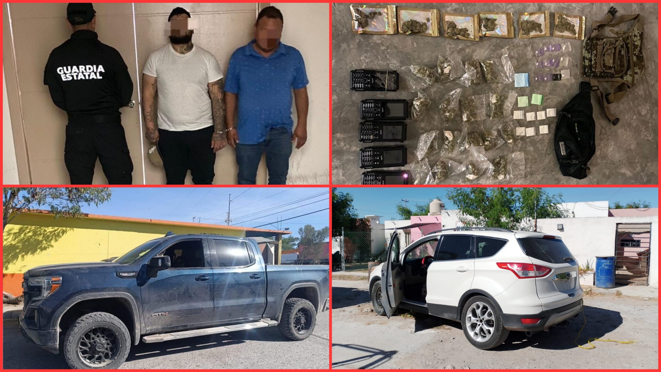 La Guardia Estatal realizó tres aseguramientos en distintos puntos de Reynosa que dejaron como resultado la detención de dos hombres, el decomiso de diversas dosis de narcóticos, la recuperación de un vehículo con reporte de robo y el aseguramiento de un arma larga, teléfonos celulares y equipo táctico. Todas las acciones fueron turnadas a la Fiscalía General de Justicia del Estado y a la Fiscalía General de la República.
