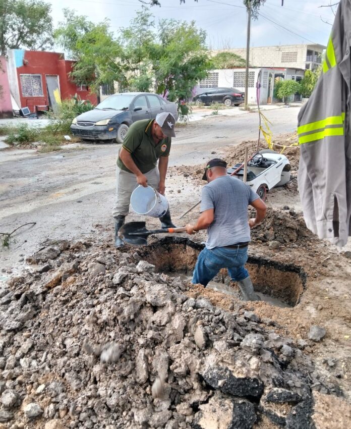 Atendiendo de manera oportuna los reportes de la ciudadanía, la Comisión Municipal de Agua Potable y Alcantarillado de Reynosa llevó a cabo maniobras de reparación de fugas de agua potable en diversos puntos del fraccionamiento San Valentín.