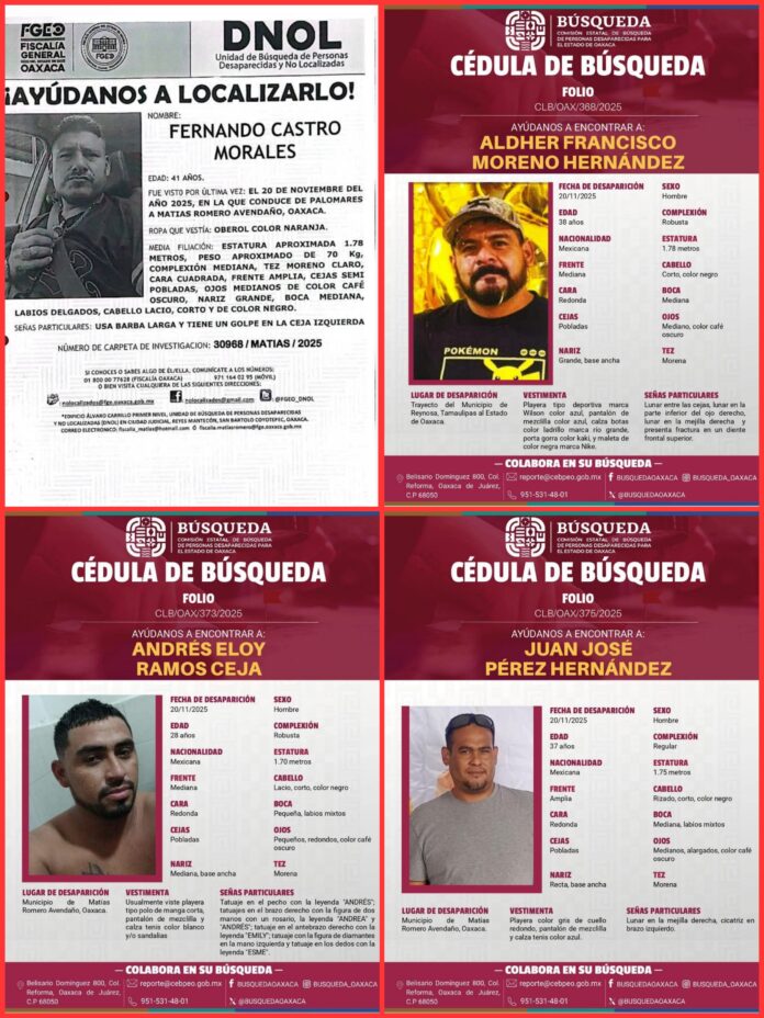 La desaparición de cuatro trabajadores vinculados al sector del transporte en el municipio de Matías Romero Avendaño, Oaxaca, mantiene en alerta a sus familias y a autoridades de distintos estados. Tres de los desaparecidos son originarios de Tamaulipas, mientras que el cuarto, Fernando Castro Morales, es del puerto de Veracruz, según confirmó su hija a este medio.