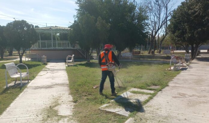 Esta mañana del lunes 26 de enero, cuadrillas de Servicios Públicos trabajan en el chapoleo y limpieza de la plaza de la colonia Antonio J. Bermudez, ubicada en bulevar Antonio J. Bermudez con Alvaro Obregón y Paseo de Los Pinos.