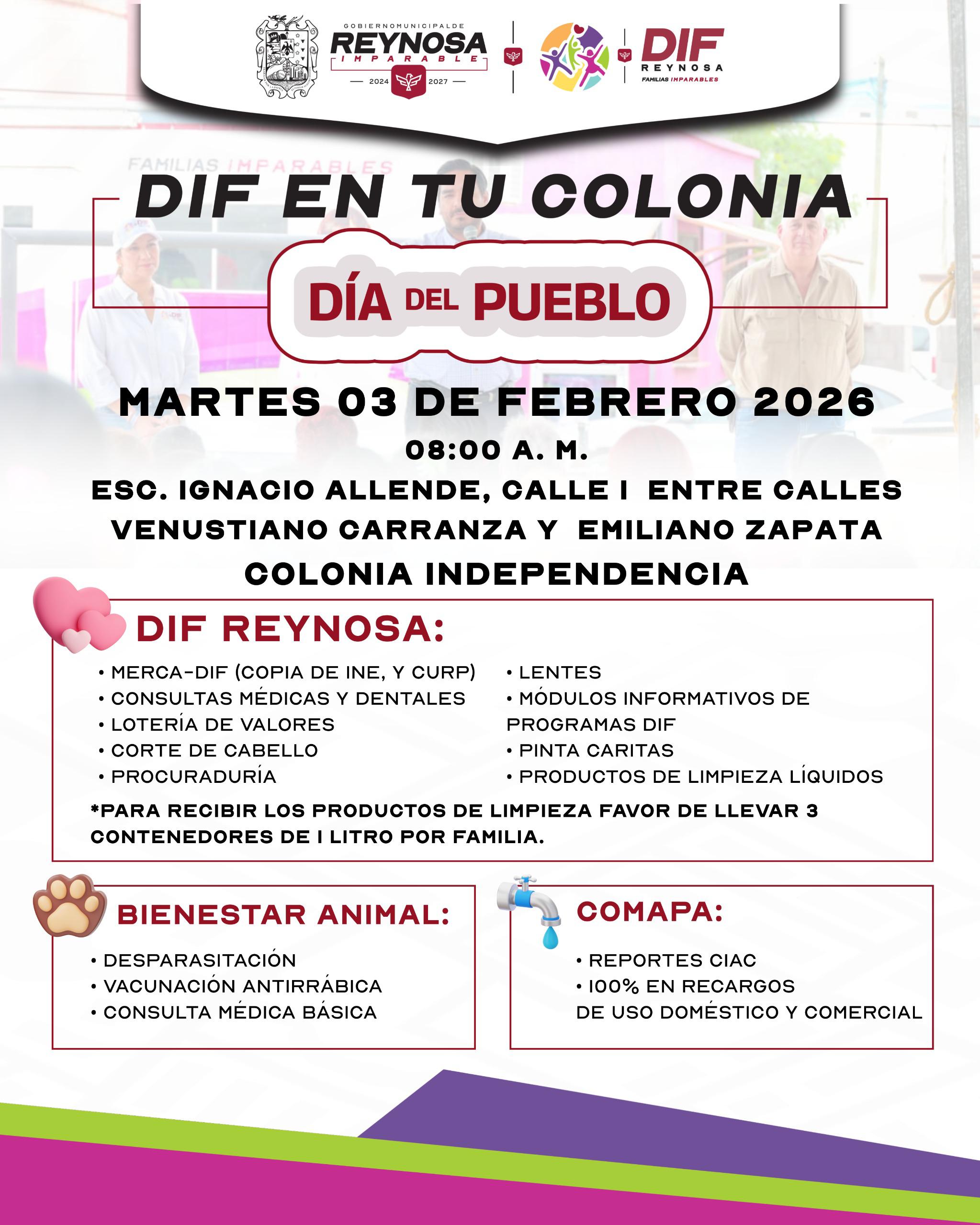 El Sistema DIF-Reynosa que encabeza Carlos Luis Peña Garza, realizará la Brigada»DIF en Tu Colonia», el martes 03 de febrero, a partir de las 08:00 de la mañana, en la Escuela «Ignacio Allende», ubicada en la calle I, entre Venustiano Carranza y Emiliano Zapata, en la colonia Independencia, con el objetivo de acercar servicios y apoyos a las familias del sector.