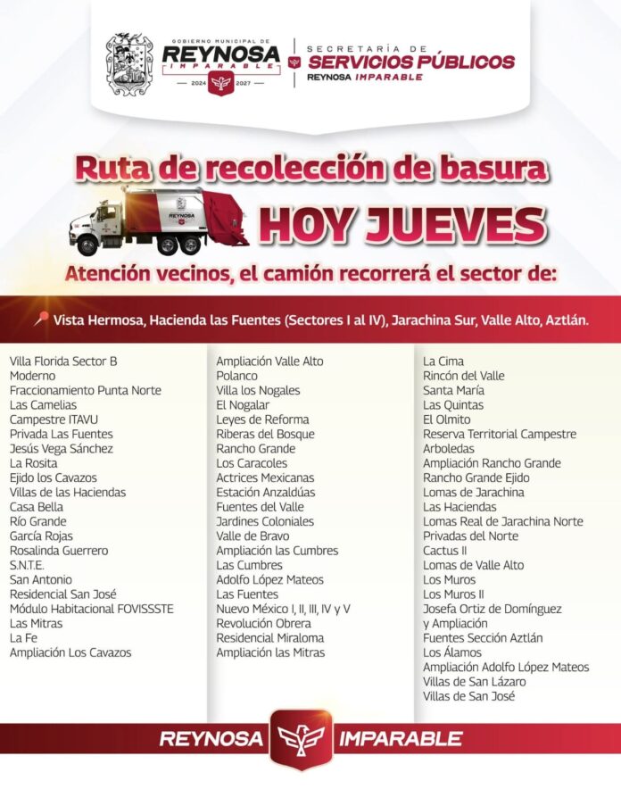 Vista Hermosa, Hacienda Las Fuentes 1, 2, 3, 4; Jarachina Sur, Valle Alto y Aztlán entre 66, colonias, ampliaciones y secciones serán atendidas por el Gobierno Municipal de Reynosa.