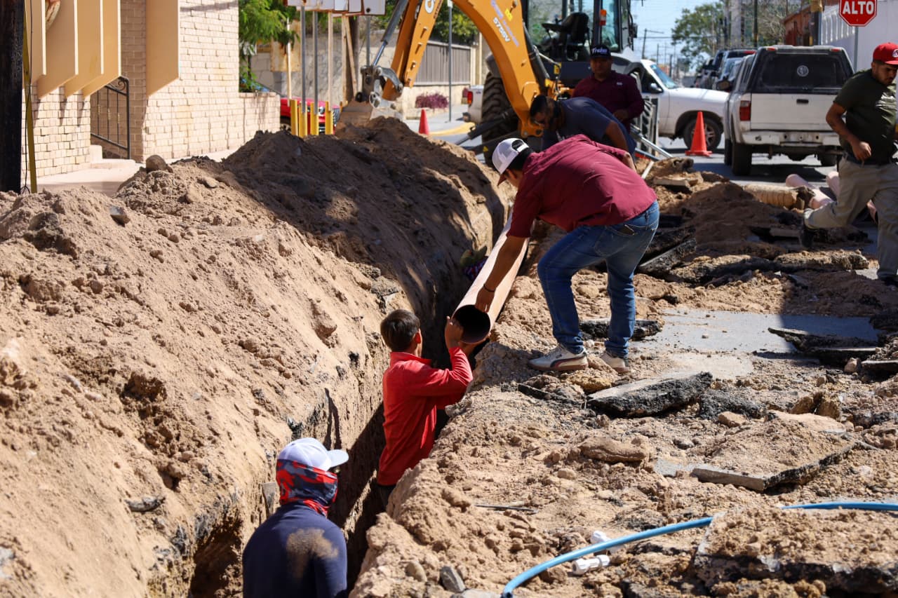 La Comisión Municipal de Agua Potable y Alcantarillado de Reynosa lleva a cabo trabajos de rehabilitación de drenaje sanitario sobre la calle Allende, esquina con Guadalupe Victoria, en la Zona Centro.
