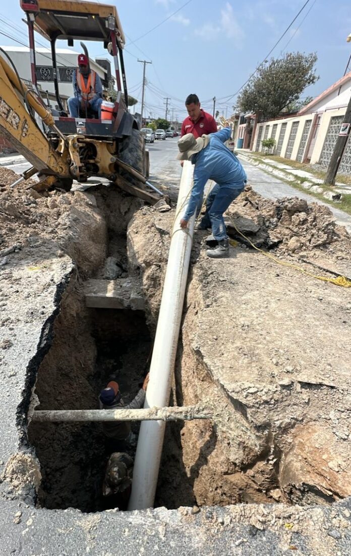 Por instrucciones del alcalde, Carlos Peña Ortiz, la Comisión Municipal de Agua Potable y Alcantarillado de Reynosa se encuentra realizando maniobras para la interconexión de línea general de drenaje sanitario en la calle Jalisco, esquina con J. A. Bermúdez, en la colonia La Presa.