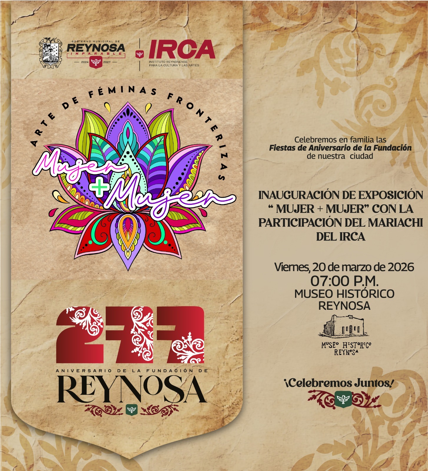 La celebración dará inicio este viernes 20 de marzo a las 7:00 P. M. en el Museo Histórico Reynosa con la inauguración de la exposición «Mujer + Mujer», con una intervención especial del Mariachi del IRCA.