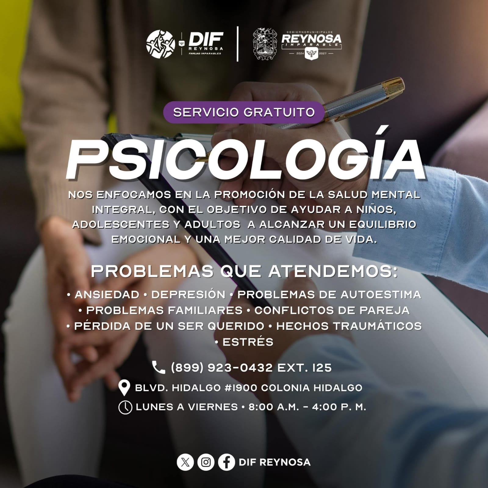 El Sistema DIF-Reynosa que preside Carlos Luis Peña Garza, ofrece a las familias el servicio gratuito de psicología, con el objetivo de brindar atención a niñas, niños, adolescentes y adultos que requieren apoyo para mejorar su bienestar emocional y calidad de vida.