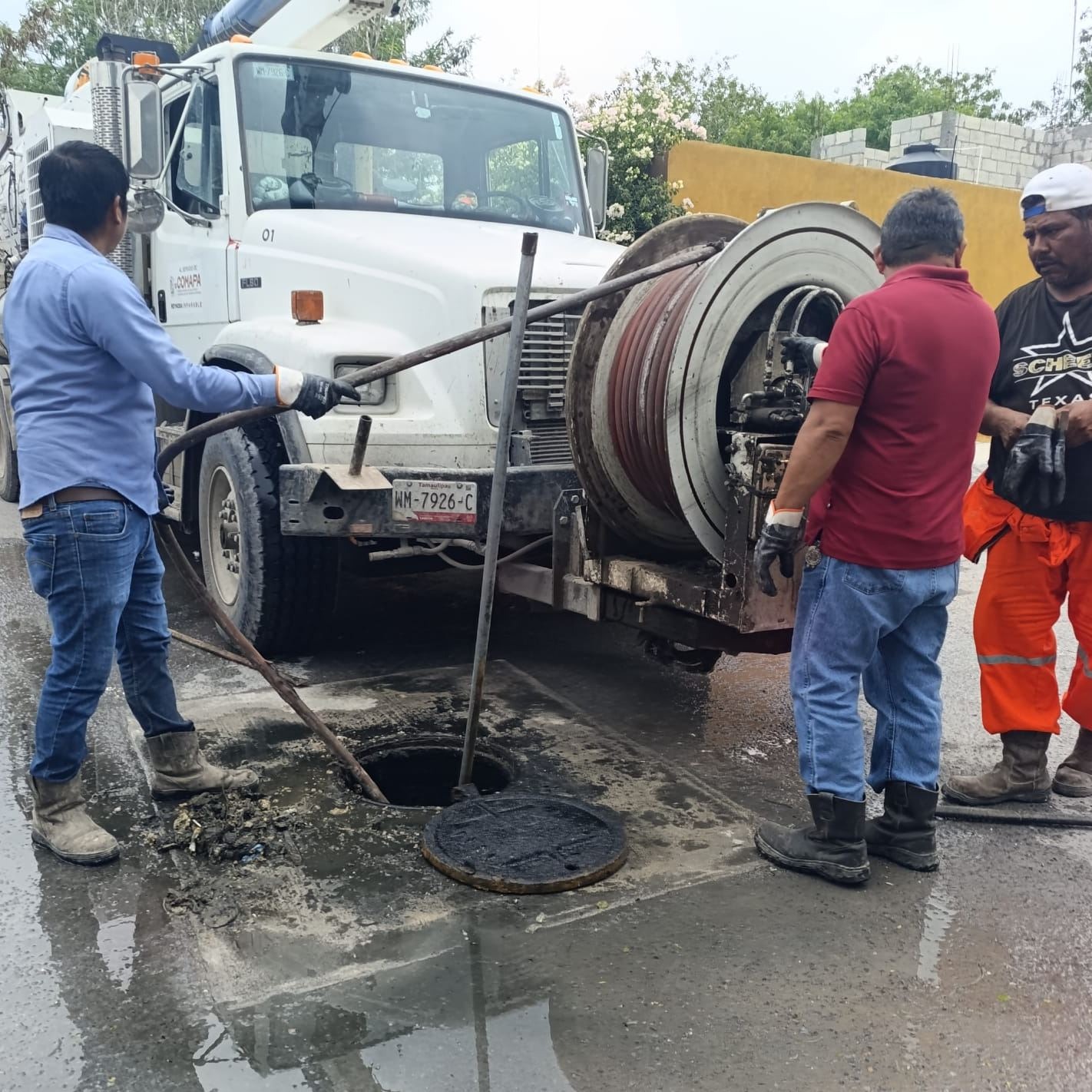 La Comisión Municipal de Agua Potable y Alcantarillado de Reynosa llevó a cabo trabajos de sondeo de la línea general de drenaje sanitario en diversas calles del fraccionamiento Hacienda Las Bugambilias, con el objetivo de mantener bajos los niveles en la red y prevenir afectaciones a las familias del sector.